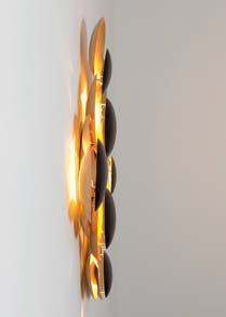 Verbindungen herstellen. Teile entdecken. Das Gemeinsame entschlüsseln. In der Wandleuchte werden die Bewegungen kleinster Teile versinnbildlicht. Alles ist im Fluß und setzt sich neu zusammen. Die 9-flammige Wandleuchte gibt uns ein Abbild unserer Stoffe, unserer Welt. Dabei sind die LED Leuchtmittel (COB) austauschbar und dimmbar. So kann die Verwandlung im Licht immer stattfinden. Das verwendete Eisenmaterial zeigt in seiner Gestaltung Gegensätze auf: einmal mit Blattgold veredelt, dann mit Schwarz gezeichnet. Und vermutet man erst, dass dieses schwarz das Licht abdeckt, läßt es dennoch das Licht auf dem goldenen Untergrund ganz neu erstrahlen. Bei längerem Hinsehen scheint es fast, als würden sich die einzelnen Kreise bewegen. Doch hier greift die eigene Fantasie ein.